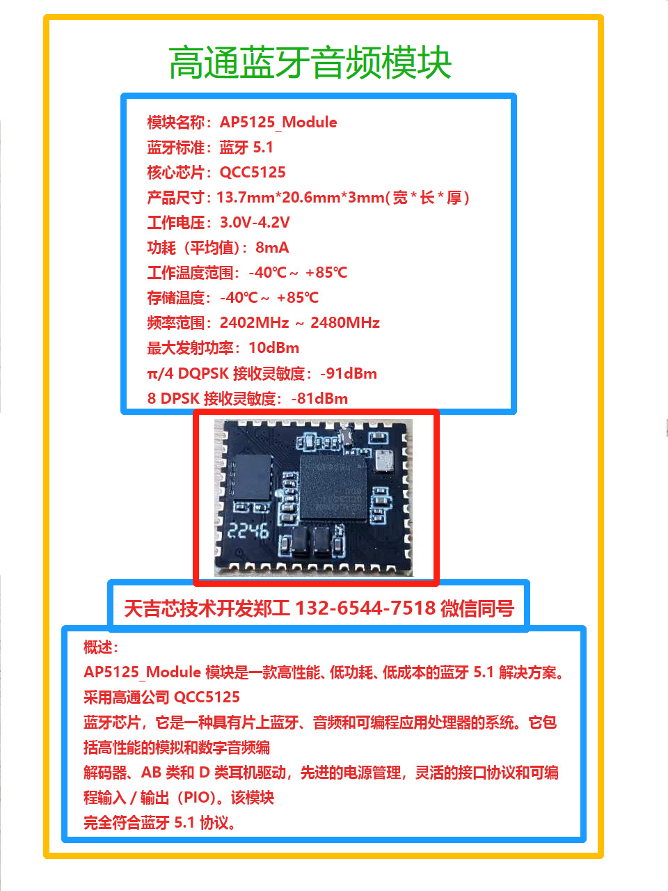 AP5125_Module 模塊是一款高性能、低功耗、低成本的藍牙 5.1 解決方案。采用高通公司 QCC5125